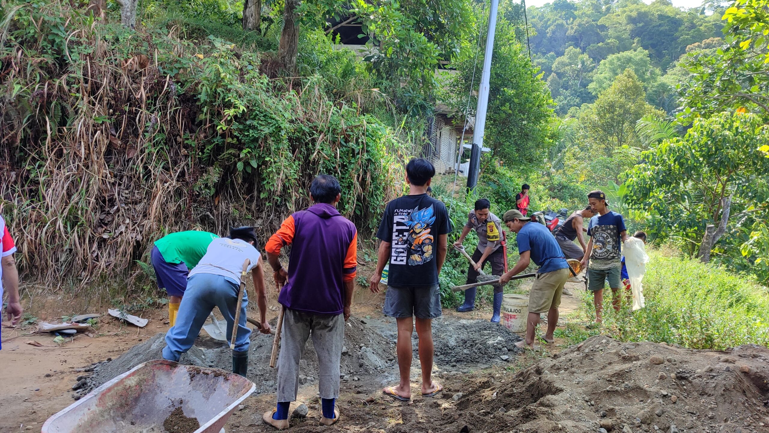 Melalui kerja bakti ini, warga bersama Bhabinkamtibmas bergotong royong memperbaiki akses jalan agar lebih mudah digunakan oleh para petani untuk menuju kebun dan mengangkut hasil pertanian.