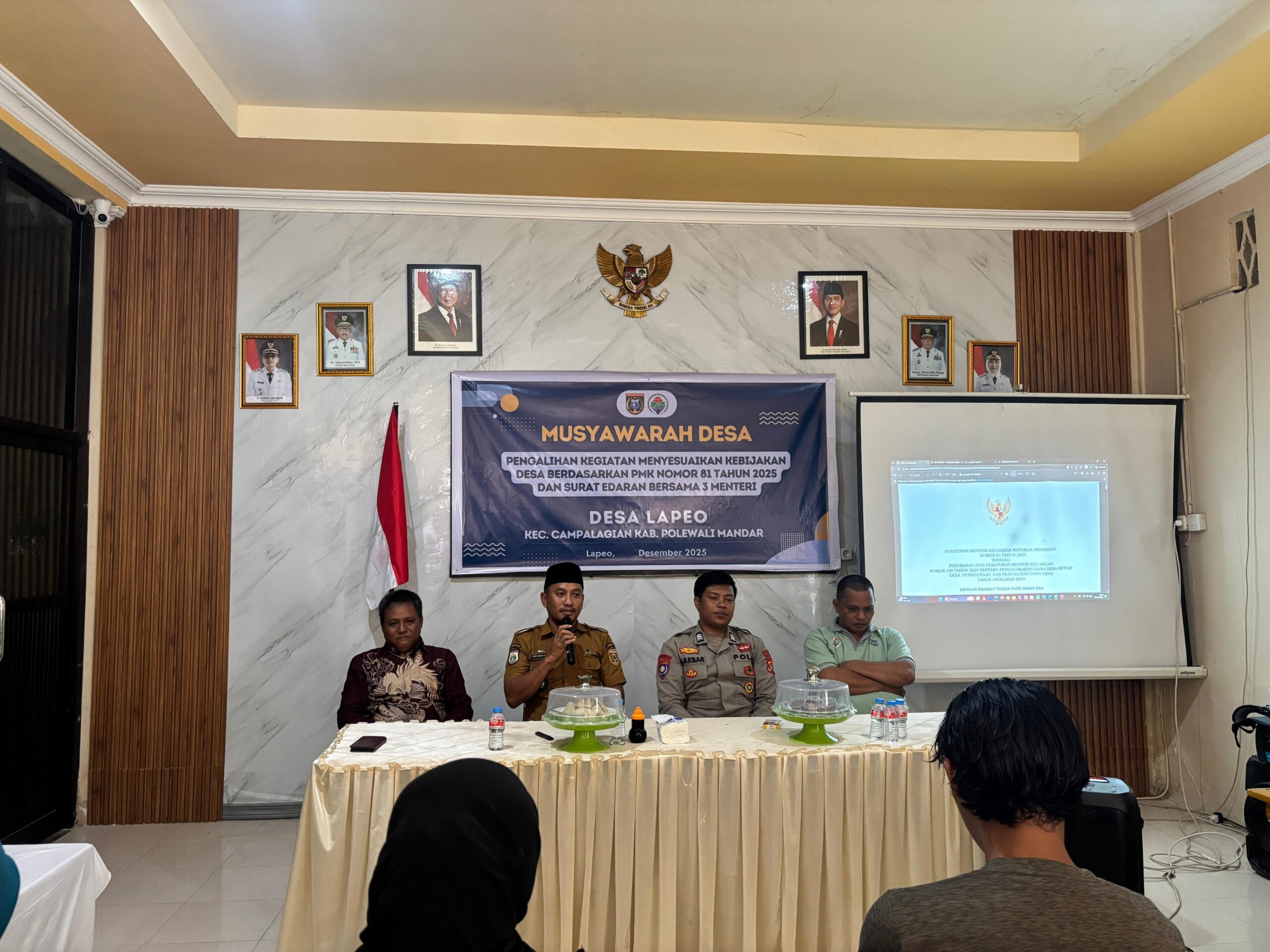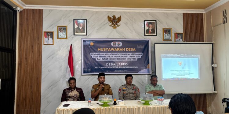 Perisaijurnalis.com, Polman – Bhabinkamtibmas Desa Lapeo Polsek Campalagian Polres Polewali Mandar menghadiri kegiatan Musyawarah Desa Penetapan Anggaran Pendapatan dan Belanja Desa (APBDes) Tahun Anggaran 2026 yang digelar di Kantor Desa Lapeo, Kecamatan Campalagian, Kabupaten Polewali Mandar, Provinsi Sulawesi Barat, Selasa (30/12/2025) sekitar pukul 14.00 Wita.