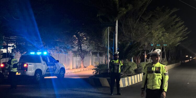 Petugas menyalakan lampu rotator mobil patroli sebagai tanda kehadiran aktif di lapangan, sekaligus mencegah potensi balapan liar dan gangguan keamanan.