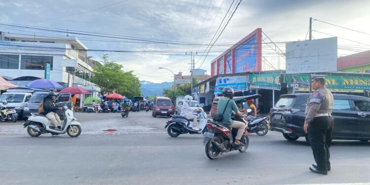 Kegiatan ini rutin dilakukan untuk memastikan arus lalu lintas di jalan-jalan utama lancar, depan Pasar, terutama saat jam sibuk masyarakat berangkat menuju aktivitas pagi.