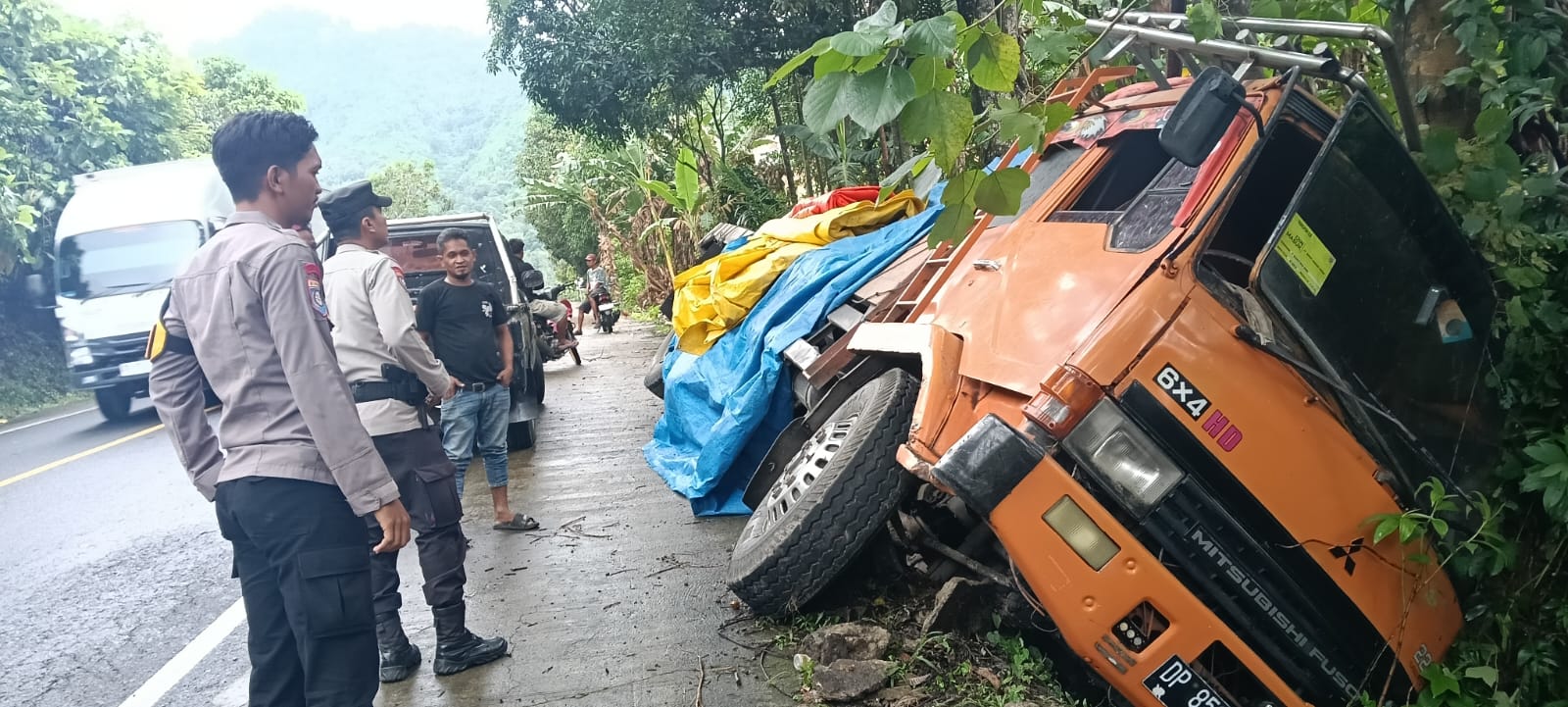 Berdasarkan hasil olah TKP, kendaraan yang mengalami kecelakaan merupakan satu unit truk Mitsubishi Fuso dengan nomor polisi DP 8598 DZ.
