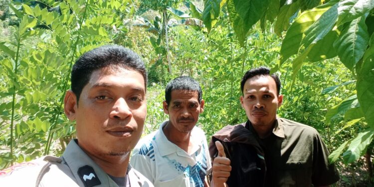 Bhabinkamtibmas Desa Saragian AIPDA Andi Zasli bersama Penyuluh Pertanian Lapangan (PPL) Desa Saragian, Bapak Maulid, mendatangi lokasi lahan jagung milik Kelompok Tani Dakko Pute.