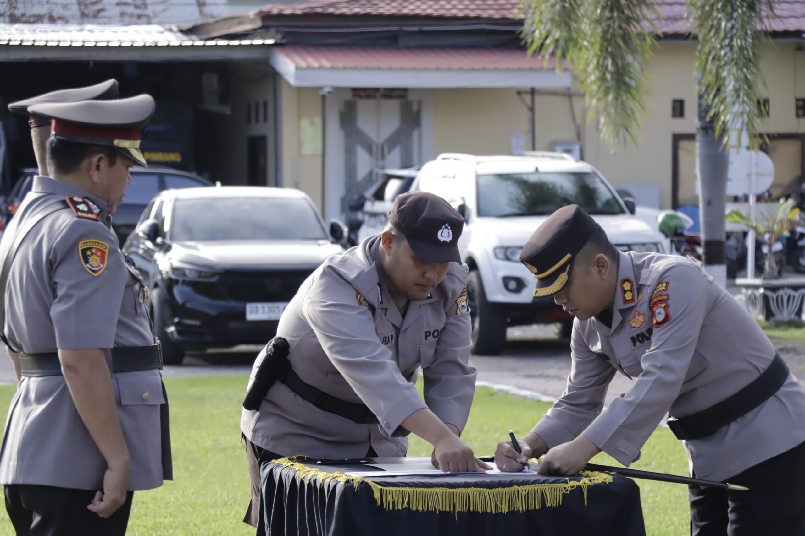 Prosesi upacara mencakup pembacaan surat telegram Kapolda Sulawesi Selatan, pengambilan sumpah jabatan yang dipandu rohaniawan, serta penandatanganan berita acara sertijab.