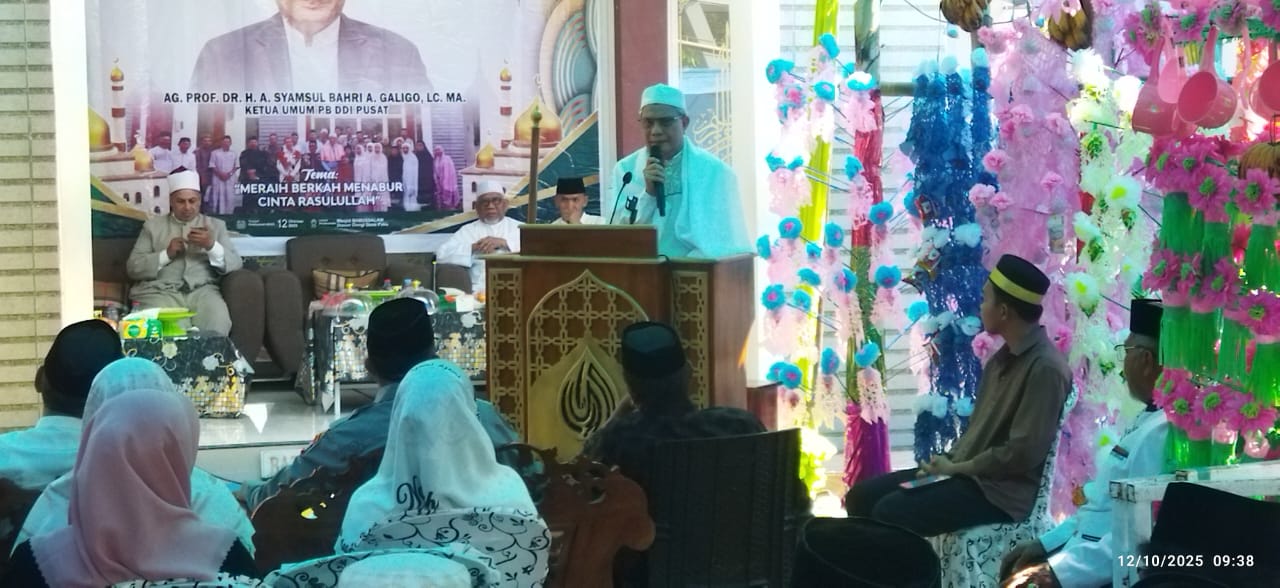Kegiatan Maulid ini mengusung tema “Meraih Berkah, Menebar Cinta Rasulullah”, dengan pembawa hikmah oleh Prof. Dr. KH. Andi Syamsul Bahri Andi Galigo, Lc., M.A., yang juga merupakan Ketua Umum PB DDI Pusat.