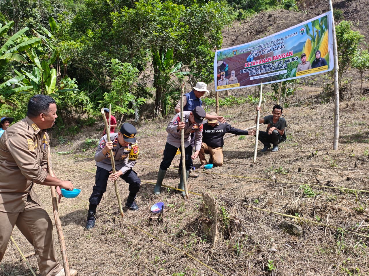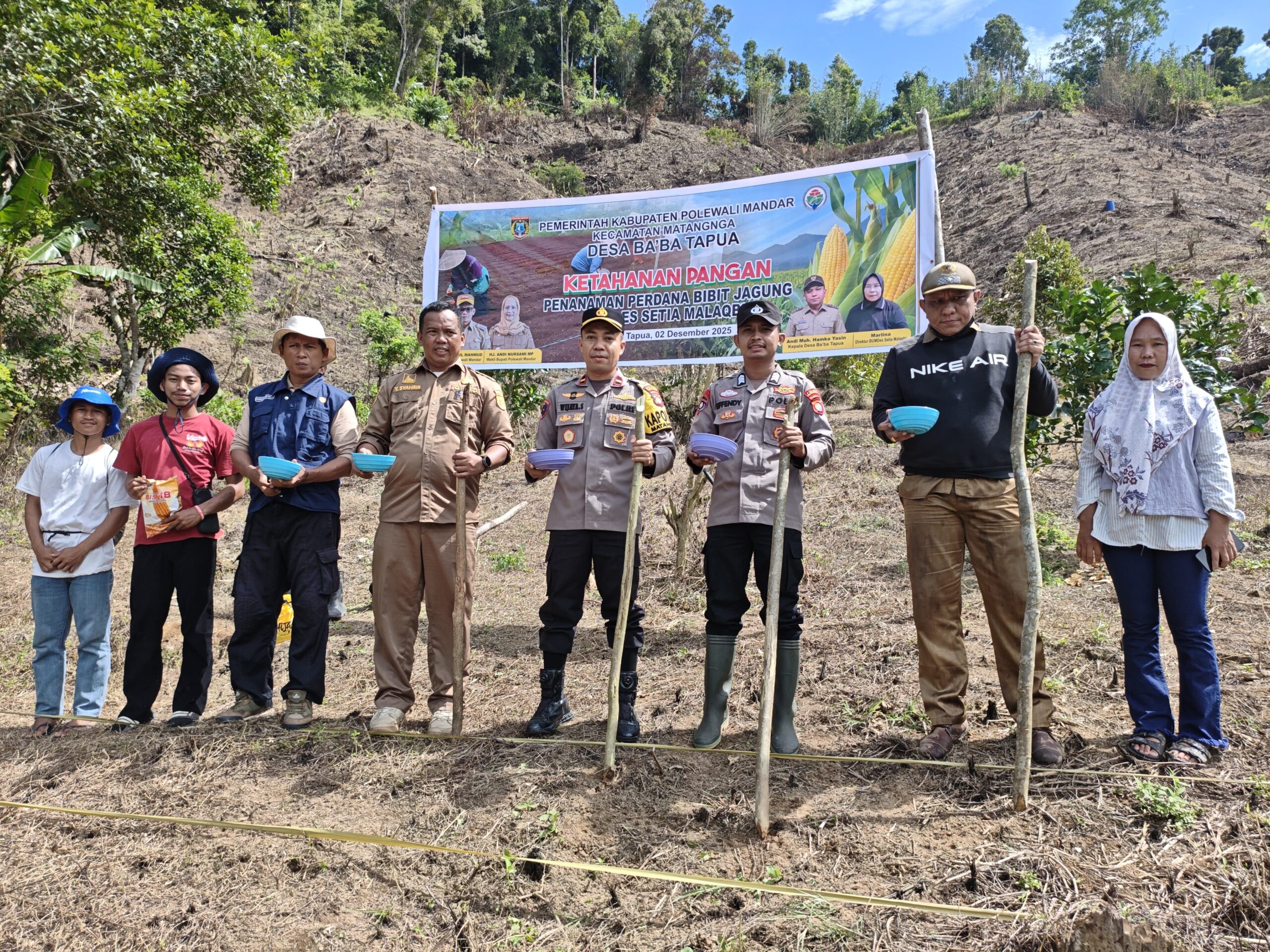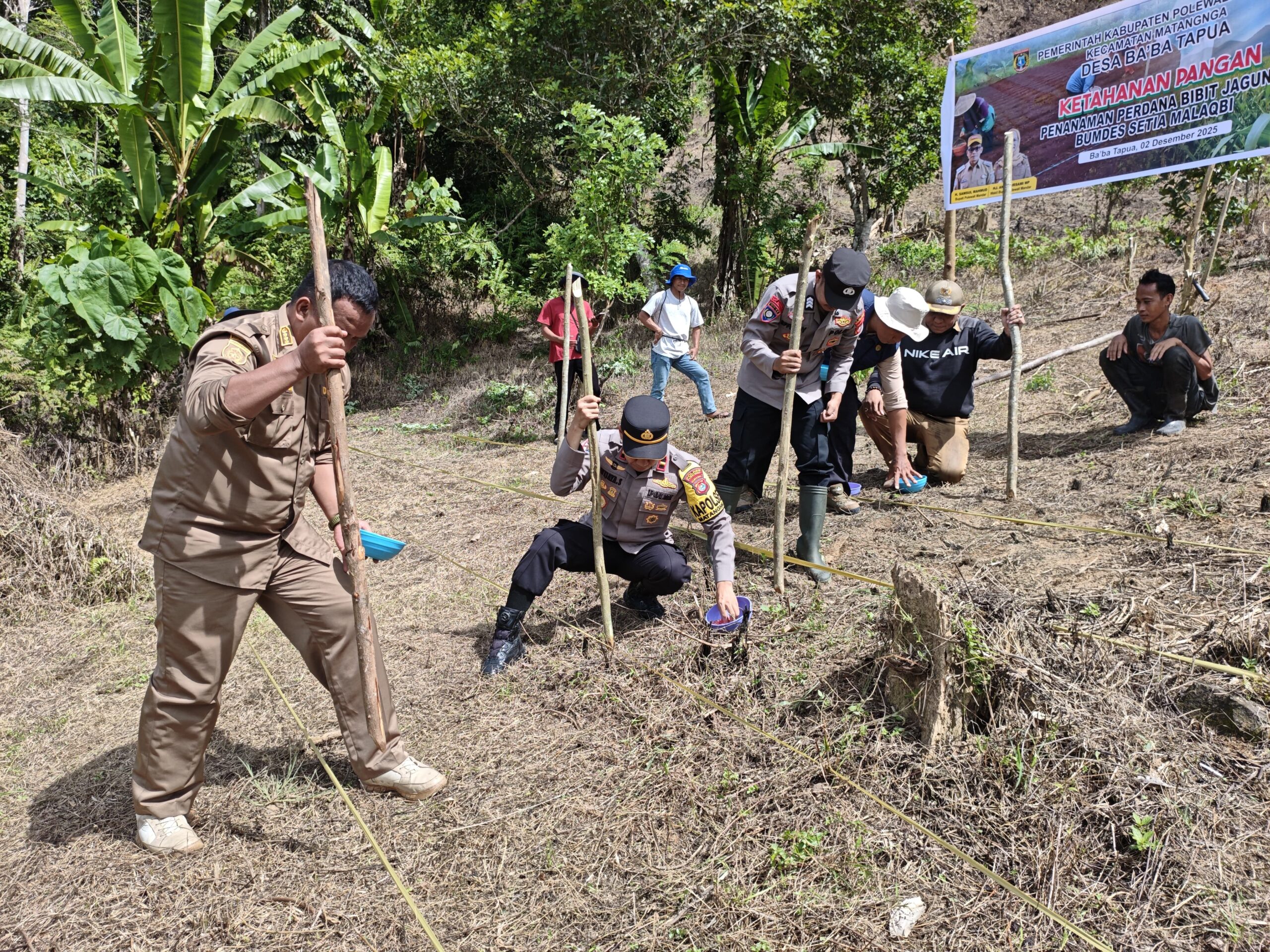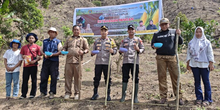 Perisaijurnalis.com, Polman – Kapolsek Matangnga Polres Polman, Ipda Wijaya Sultan, SH, bersama Bhabinkamtibmas Desa Tapua, Brigpol Effendy, melaksanakan kegiatan penanaman jagung di Desa Ba’ba Tapua, Kecamatan Matangnga, Kabupaten Polewali Mandar, Provinsi Sulawesi Barat, Selasa (02/12/2025).