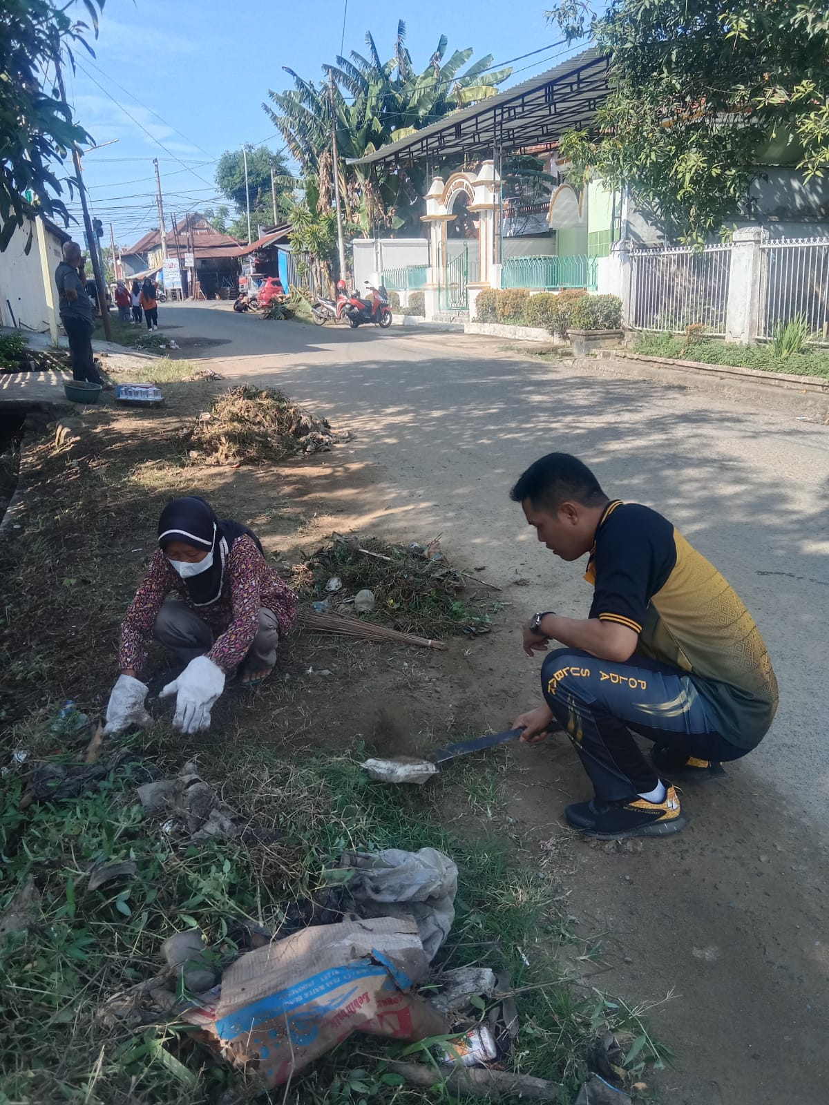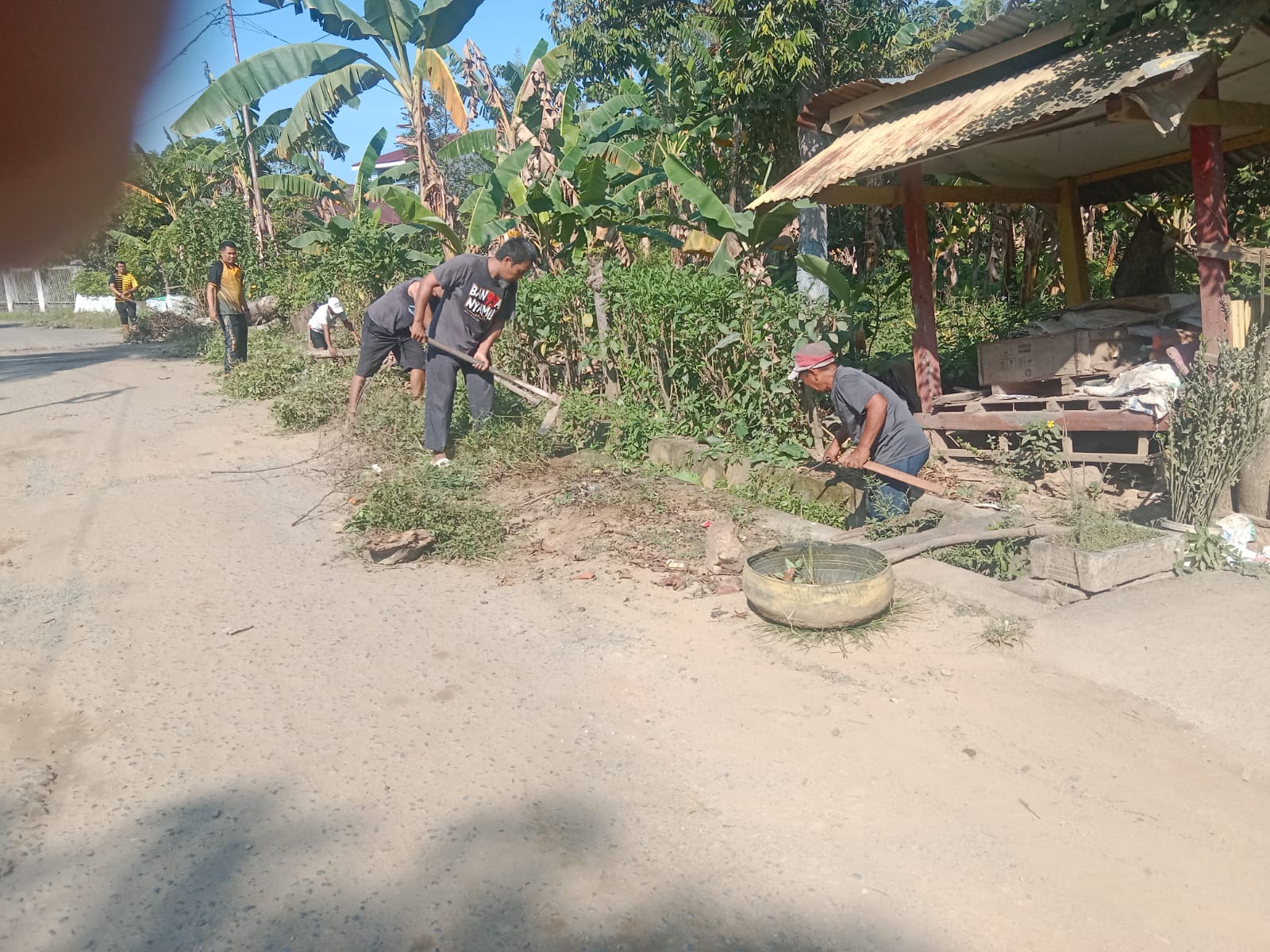 Kegiatan gotong royong difokuskan pada pembersihan drainase serta pemangkasan rumput liar di sepanjang jalan lingkungan.