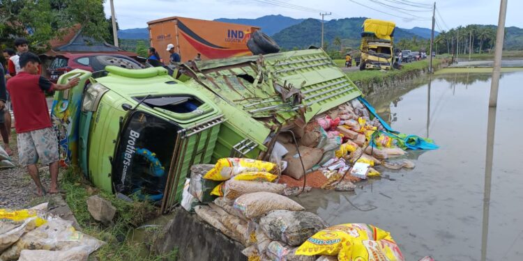 Mengakibatkan 1 (satu) unit mobil light truck hino warna hijau No.Pol DC 8841 CQ, yang dikemudikan oleh Ansar terbalik dan jatuh ke area persawahan warga, sedangkan 1 (satu) unit mobil mitsubishi light truck box logistik cargo warna orange No.Pol B 9008 CXT dan 1 (satu) unit mobil light truck mitsubishi warna kuning No.Pol DC 8840 AX berada diatas badan jalan, yang mengakibatkan laka lantas dengan korban Sdr. KAHAR mengalami luka-luka.