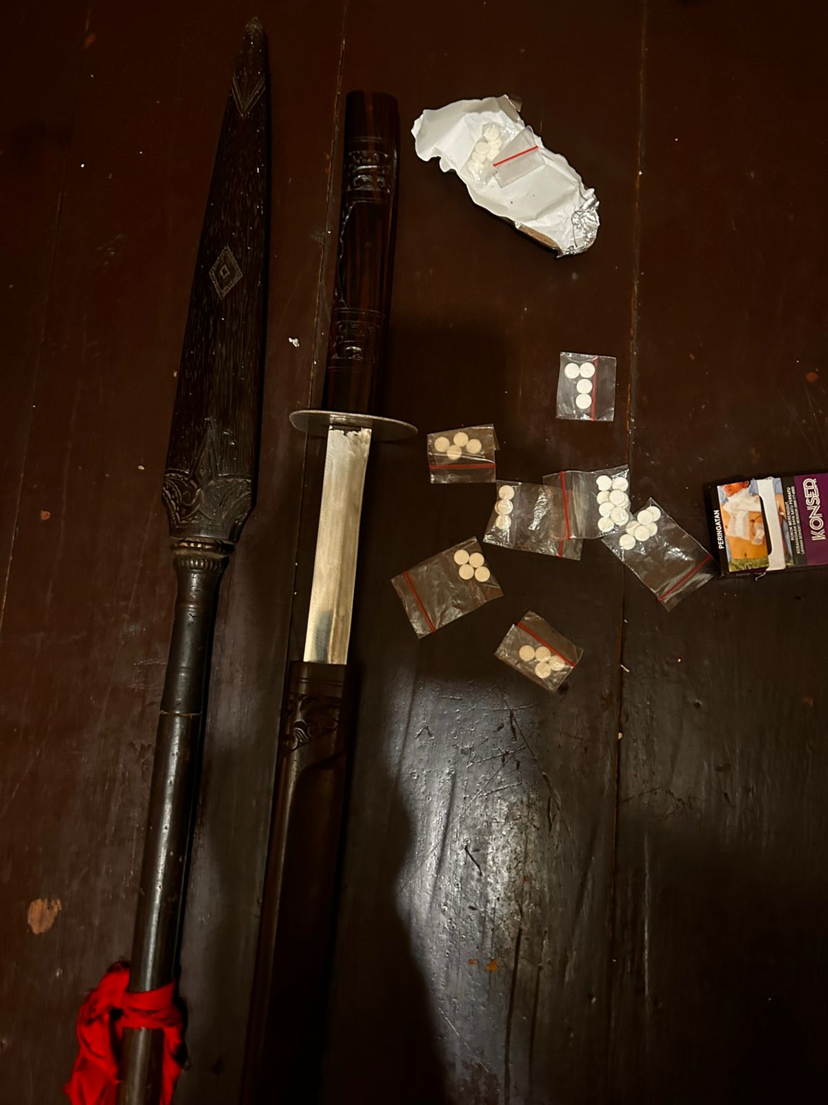 Setibanya di tempat, petugas menemukan sekelompok pemuda yang tengah berkumpul dan membawa sejumlah sajam jenis tombak dan samurai katana serta obat obatan yang diduga termasuk narkotika jenis boje yang disembunyikan di balik pakaian maupun dalam tas.