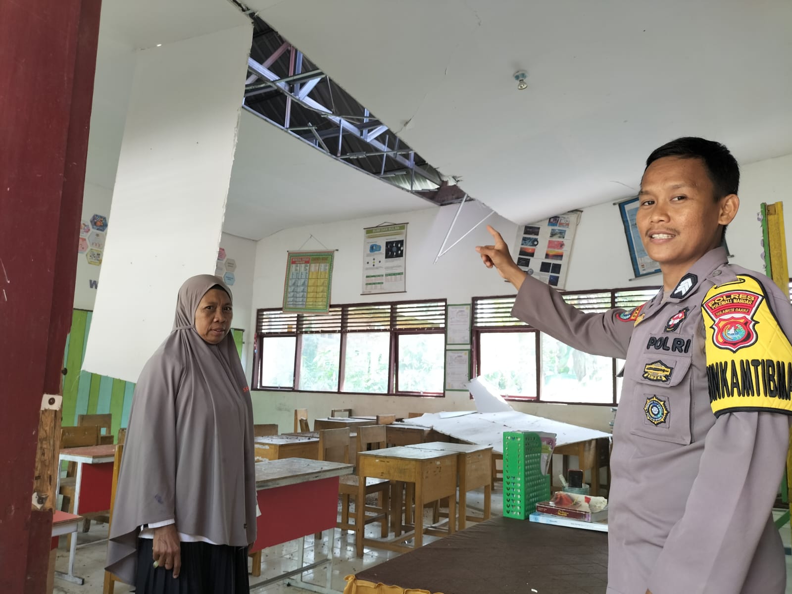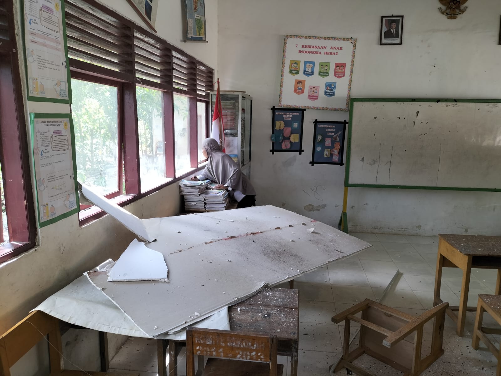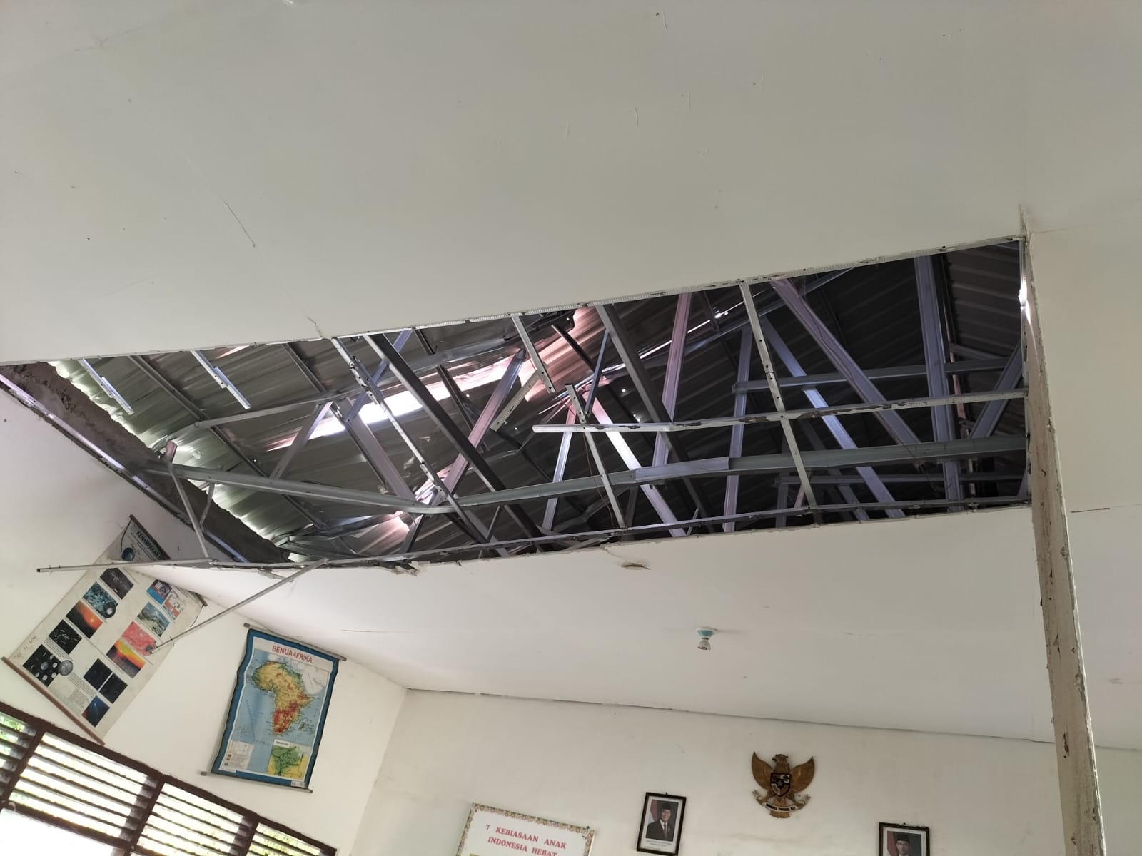 Dari hasil pengecekan di lapangan, diketahui bahwa pohon kelapa tersebut menimpa bagian atap ruang kelas V, sehingga menyebabkan kerusakan pada genteng dan plafon ruang kelas.