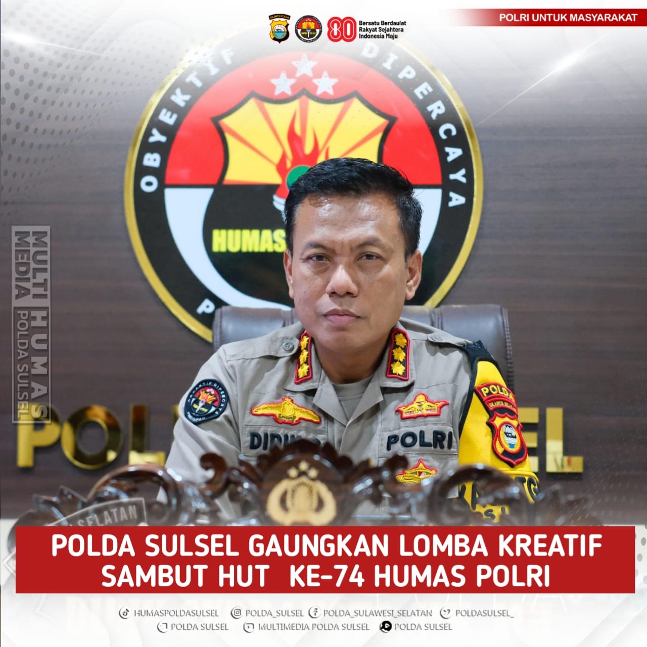 Perisaijurnalis.com, Makassar – Dalam rangka menyambut Hari Ulang Tahun (HUT) Humas Polri ke-74 yang jatuh pada 30 Oktober 2025, Kepolisian Daerah Sulawesi Selatan (Polda Sulsel) menggelar lomba kreatif yang terbuka bagi masyarakat umum, pelajar, mahasiswa, maupun anggota Polri. Kegiatan ini merupakan bagian dari rangkaian nasional yang diinisiasi Divisi Humas Polri dengan mengusung tema “Polri Humanis Harapan Masyarakat.”