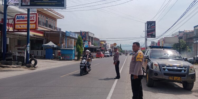 Polisi hadir sejak pagi hari untuk mengatur kendaraan yang melintas, memastikan pelaksanaan protokol keselamatan jalan raya, serta memberikan arahan kepada pengendara agar mematuhi aturan lalu lintas.