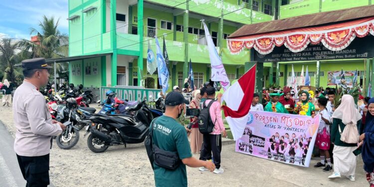 Perisaijurnalis.com, Polman – Personel Kepolisian dari Polsubsektor Luyo melaksanakan pengamanan pada kegiatan devile pembukaan Pekan Olahraga dan Seni (Porseni) MI-MTs DDI Baru, Senin pagi (08/12/2025).