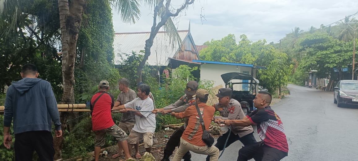 “Kami bersama personel TAGANA dan masyarakat setempat melakukan gotong royong memindahkan pohon kelapa yang tumbang agar tidak menimbulkan bahaya lanjutan,” ujar IPDA Sumarlin.