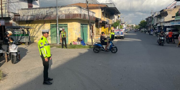 Dalam pelaksanaannya, personel Unit Siaga Sat Lantas melakukan pengaturan arus kendaraan, membantu penyeberangan masyarakat, serta memberikan imbauan tertib berlalu lintas kepada para pengendara.