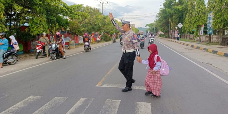 Dalam kegiatan ini, personel melakukan pengaturan arus lalu lintas, membantu penyeberangan pelajar dan masyarakat, serta memastikan situasi tetap aman dan kondusif.