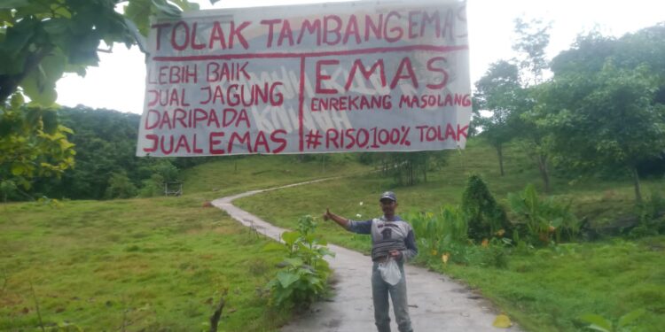 Spanduk terpampang dengan tulisan “Tolak Tambang Emas“ Lebih Baik Jual Jagung Daripada Jual Emas. EMAS Enrekang Masolang #Riso100% Menolak di wilayah mereka.