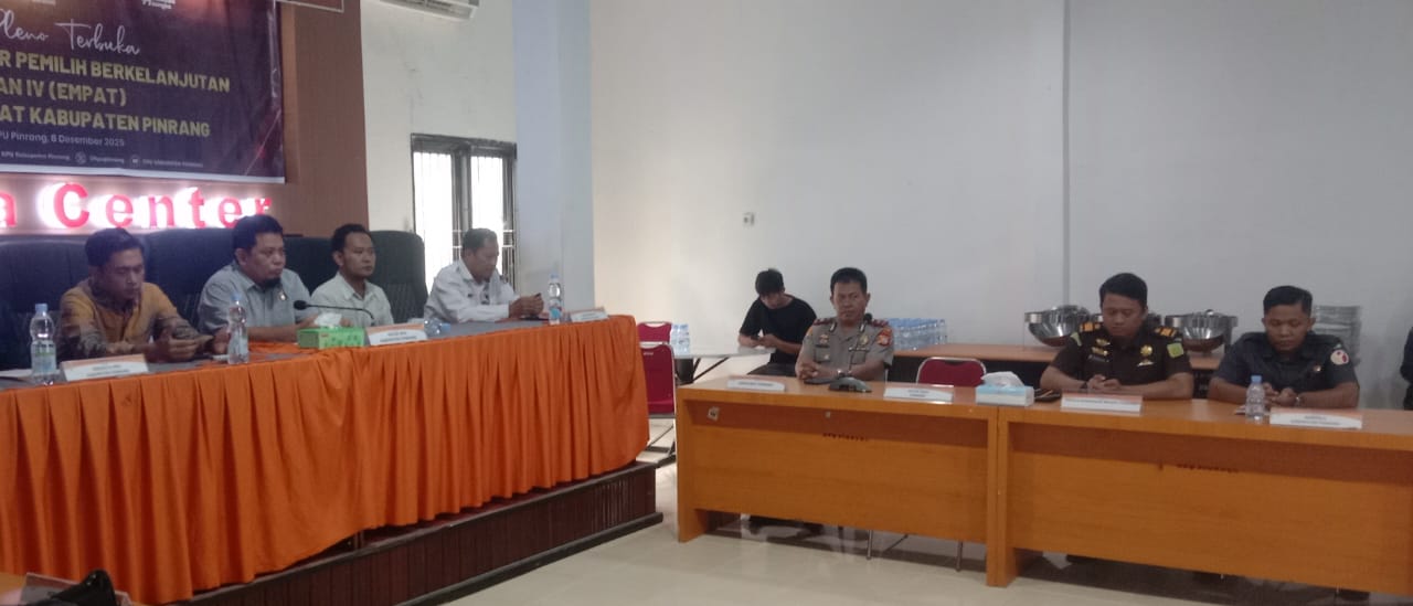 Perisaijurnalis.com, Pinrang – Komisi Pemilihan Umum (KPU) Kabupaten Pinrang, Provinsi Sulawesi Selatan menggelar Rapat Pleno Terbuka Rekapitulasi Daftar Pemilih Berkelanjutan (DPB) Triwulan IV Tahun 2025 di Aula KPU Pinrang, Senin (8/12/2025). Kegiatan ini dihadiri Wakapolres Pinrang KOMPOL Muhammad Yusuf Badu, S.H., bersama perwakilan Forkopimda, Bawaslu, dan instansi terkait. Pleno berlangsung tertib sebagai bagian dari agenda rutin pemutakhiran data pemilih.